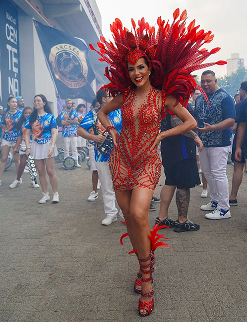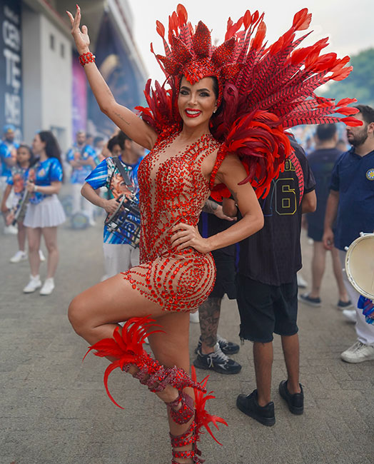Com um look sensual e glamoroso, a Rainha de Bateria da Acadêmicos do Tucuruvi apostou em um vestido inteiramente trabalhado em pedrarias vermelhas sobre tule transparente, criando o efeito de segunda pele e valorizando a silhueta com desenhos simétricos e esculturais.