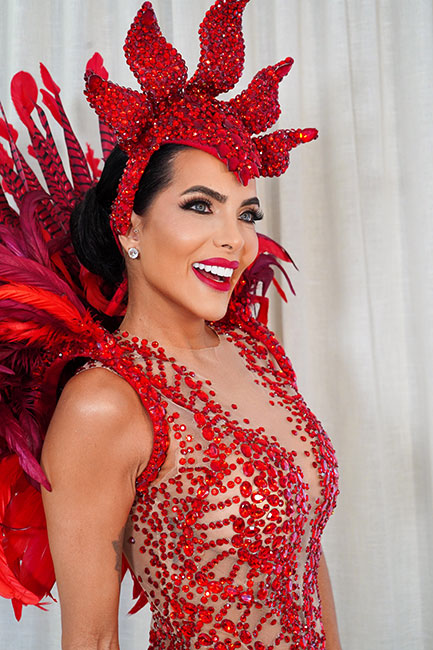 Para coroar o visual, um imponente cocar cravejado de cristais vermelhos se abre em formato de pétalas, reforçando a atmosfera de força, sensualidade e exuberância que marca a identidade da fantasia.